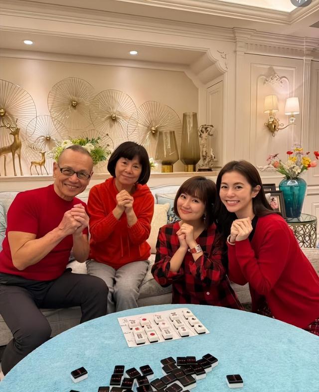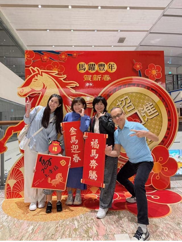 照片中的Selina留着利落的短发,身着一件蓝色百褶长裙,裙摆轻盈,衬得她气质温婉。与父母、妹妹并肩而立的她,难掩团聚的喜悦,一只手比出爱心手势,另一只手握着一张新年贺卡,眉眼弯弯,笑意盈盈,模样依旧靓丽动人。